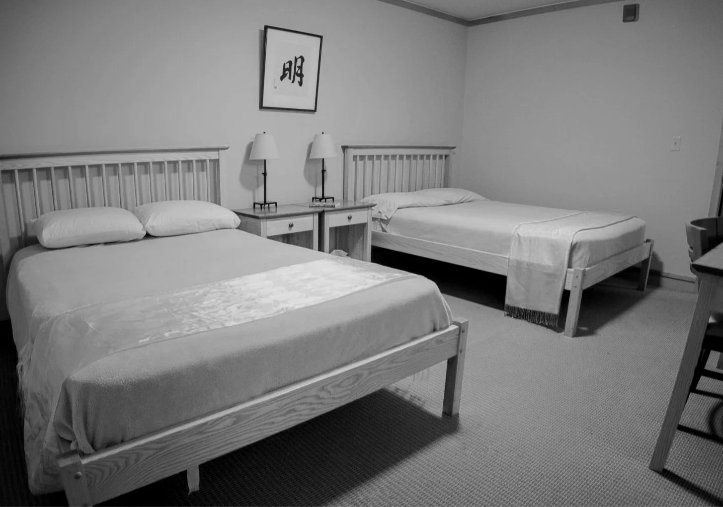 Simple room with two separate full bed, desk, closet, and private bathroom.